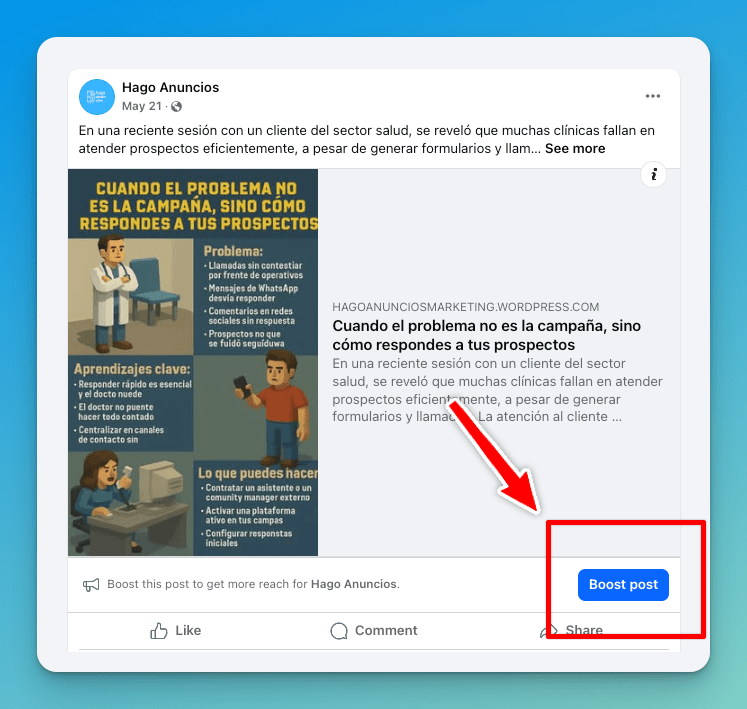 Si tienes un negocio y estás tratando de hacer publicidad en redes sociales, probablemente has visto ese pequeño botón tentador en tus publicaciones que dice “Promocionar publicación” (o “Boost Post” en inglés). Suena fácil, ¿verdad? Un par de clics y listo, tu publicación se convierte en un anuncio. Pero, ¡alto ahí! Hoy te explico por qué nunca deberías usar ese botón si realmente quieres que tu inversión en publicidad rinda frutos.